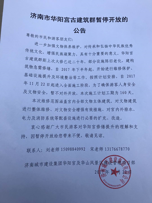11月22日,因華陽宮古建筑群部分設(shè)施陳舊老化,建構(gòu)筑物急需修繕,即日起進入全面施工修復(fù)階段。濟南城市建設(shè)集團華陽宮及華山風(fēng)景區(qū)建設(shè)管理項目部發(fā)布濟南市華陽宮古建筑群暫停開放的公告。
