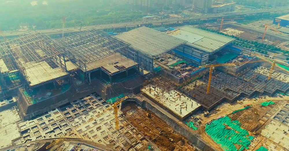 目前,展館區(qū)域主體鋼結(jié)構(gòu)進(jìn)入收尾階段,其中4號(hào)館、5號(hào)館已完成主體結(jié)構(gòu)驗(yàn)收,已全面轉(zhuǎn)入金屬屋面、幕墻外圍護(hù)體系及室內(nèi)裝飾、安裝施工階段;1號(hào)館、2號(hào)館及3號(hào)館主體鋼結(jié)構(gòu)施工正處于收尾階段;整個(gè)展館區(qū)域計(jì)劃6月底主體結(jié)構(gòu)封頂。