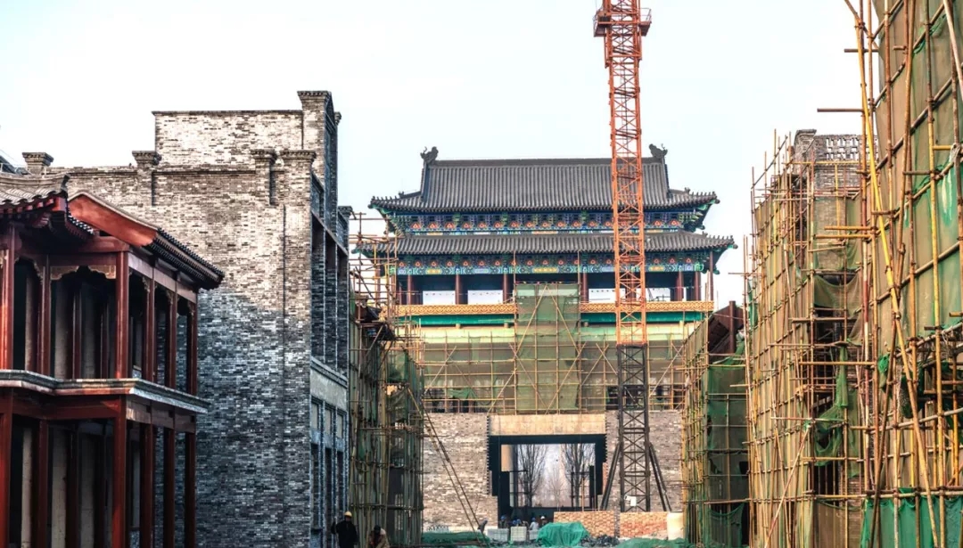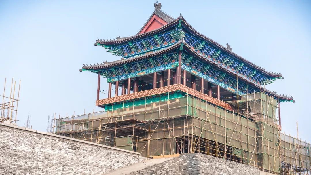 項目所有建筑中,最具標志性的當屬城門樓,同時,這也是項目內工程量最大、工期最長的單體建筑。其中城墻高度為8.7米,城門樓最頂端高度為29.5米。僅城門樓施工使用的鋼管就已達20萬米,占整個項目鋼管消耗量的近一半,從基礎施工到主體完工,耗時近4個月。城門樓的彩繪部分采用的是旋子彩繪形式,用或圓潤飽滿、或流暢柔韌的各色線條旋轉盤結而成,最大的特點是在藻頭內使用了帶卷渦紋的花瓣,旋子常用于殿式彩畫,既素雅又華美。