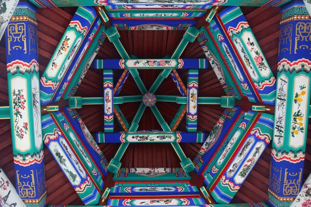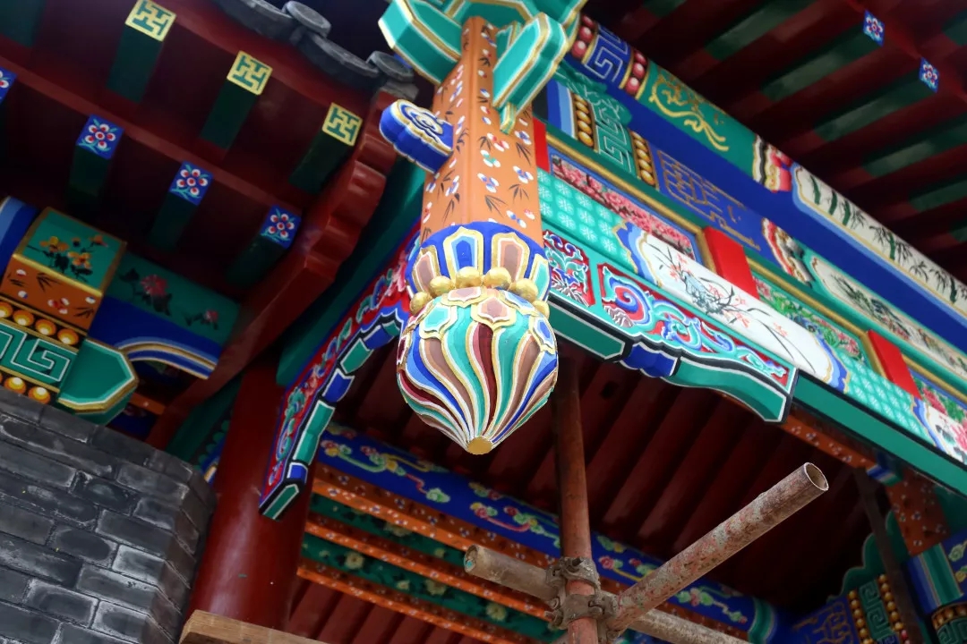 項目中仿古建筑的涂刷油漆部分做地仗都是采用“豬血+桐油”的古法油漆(“地仗”是一種采用“一麻五灰”的古老傳統工藝的施工做法)。仿古地仗油漆成活一般需要基層處理、下竹釘、捉縫灰、通灰、裹布等12道工序。清代彩繪的種類非常豐富,從紋飾的主體框架構圖和題材方面分類可分五大類:和璽類、旋子類、蘇式類、海墁類和吉祥草類。“親王府”區域的建筑彩繪主要采用了三種繪畫形式,王府中軸線上建筑部分采用旋子墨線小點金彩繪,體現為輪廓線均用墨線,花心點金的形式;配房部分采用雅伍墨旋子彩繪,指完全不用金,線條用墨,旋子用藍、綠、白、黑四色,花瓣不起暈;長廊與園林部分的小型建筑部分采用蘇式彩繪,蘇式彩繪畫面內容豐富,自然山水、花鳥魚蟲、各式人物一應俱全。彩繪待地仗完成后還需依次為:丈量起譜子、刷生油、磨平、過水布、分中、打普子、瀝大小粉等13道工序。