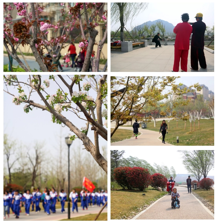 在華山歷史文化濕地公園一期內,湖邊碧桃、海棠、櫻花等樹木盛開,連翹燦爛,色彩斑斕,步移景異,快車道旁草木叢生,丁香花開沁人心脾,蜂蝶相伴,生機勃勃,吸引眾多市民游客前來游玩賞花。