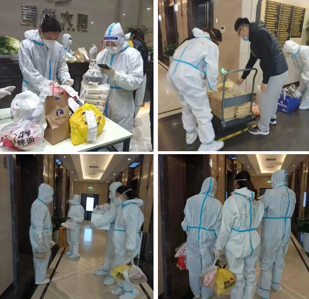 因項目臨時封控,為防止業(yè)主上下樓層增加交叉感染的可能性,善能大廈福仁服務(wù)全體員工全副武裝,統(tǒng)一為業(yè)主配送餐食,保障業(yè)主的正常就餐,讓業(yè)主吃好、吃飽,緩解因封控帶來的情緒壓力。等他們忙碌完送餐的工作,又要投入到其他防疫工作中去,常常一天下來也無法保證吃上一頓飯,可她們卻微笑著說:“忙下來也不覺得餓,能讓業(yè)主安心,及時吃上熱乎飯,我們就放心了……”