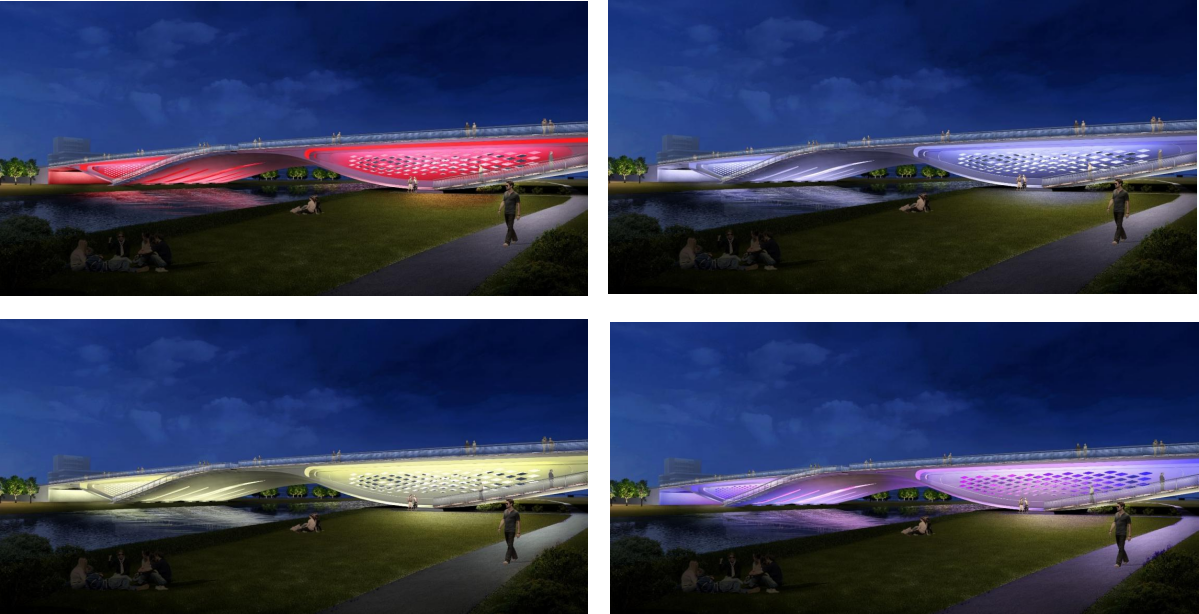 橫一路、橫二路大寺河橋作為起步區規劃的第一批景觀橋梁,由濟南城市建設集團有限公司受委托建設,兩座橋梁由世界著名橋梁設計師Marc MIMRAM先生主設計,通過研究濟南的歷史和文化,以泉與太極這個設計為根基,將泉城的剛中有柔、柔中帶剛,與太極互為印證,力與美相結合,完成兩座景觀橋梁的設計。