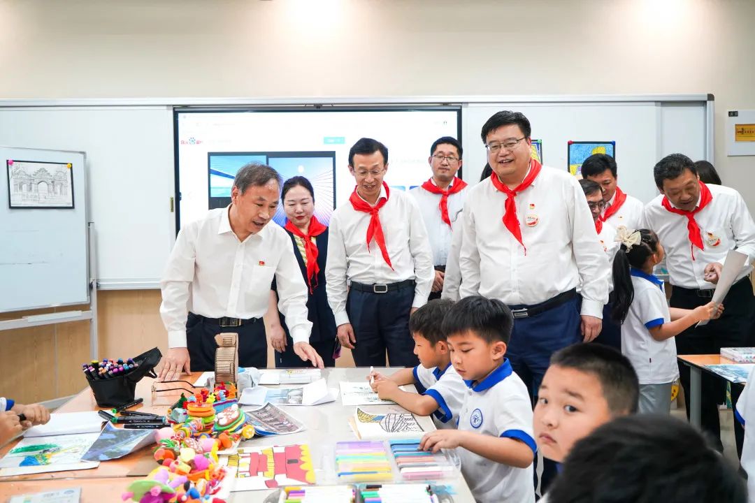 活動結(jié)束后,孫常建一行在楊柳春風(fēng)學(xué)校進(jìn)行了實(shí)地參觀調(diào)研,了解了書香校園建設(shè)活動,并與孩子們進(jìn)行了親切交流。孩子們熱情洋溢地介紹了“槐蔭少年說”黨團(tuán)隊(duì)一體化品牌建設(shè)活動、“我是黃河岸邊好少年”黃河文化項(xiàng)目化學(xué)習(xí)特色課程、“我眼中的康養(yǎng)名城、活力槐蔭”畫展和手工展、“家住槐蔭‘育’見成長”教育品牌、學(xué)校校訓(xùn)和南北融合辦學(xué)理念等情況,并進(jìn)行了古箏、寫生、經(jīng)典誦讀等美育教育特色活動表演,美術(shù)社團(tuán)、舞蹈社團(tuán)、合唱團(tuán)、足球社團(tuán)、啦啦隊(duì)的成員代表們進(jìn)行了成果展示。