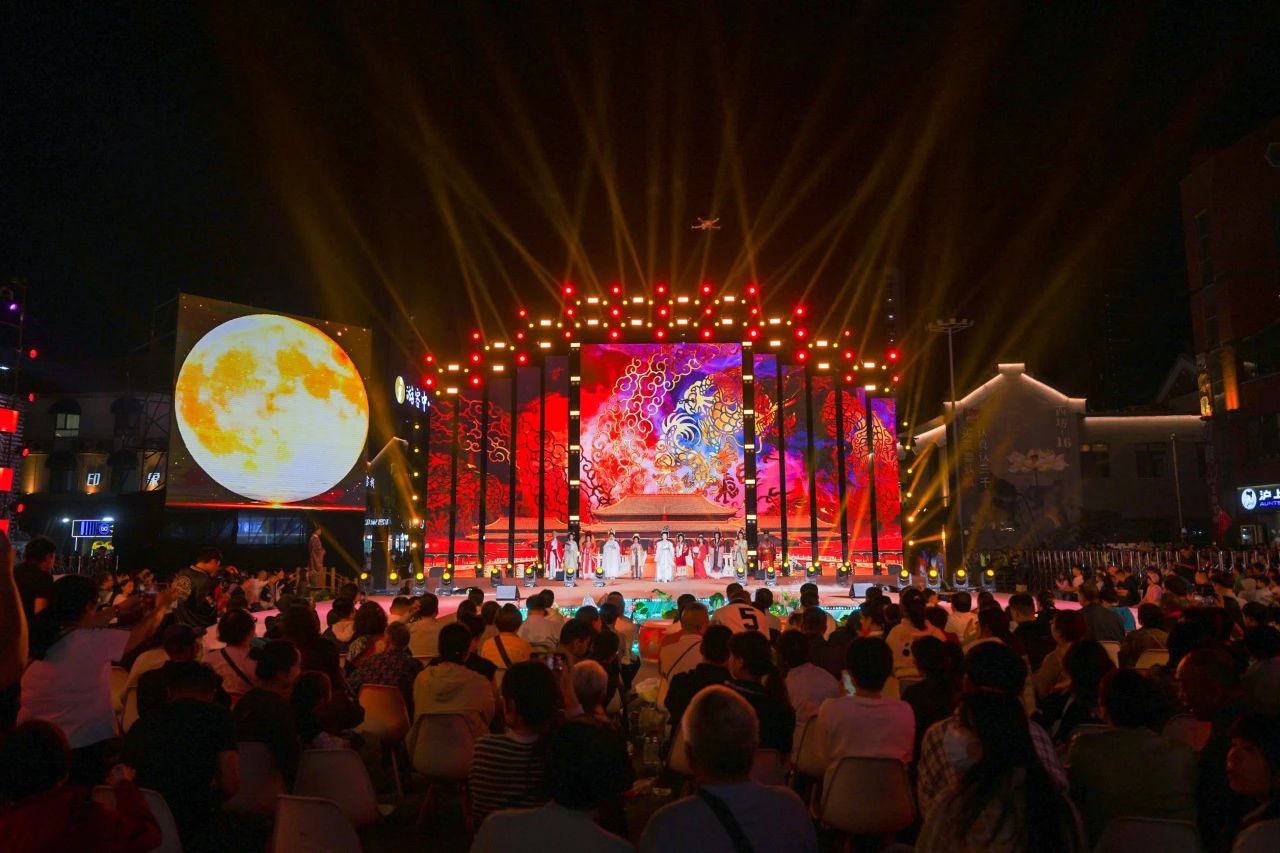 音樂、舞蹈、雜技、燈光秀……街區上流光溢彩、燈火輝煌,舞臺上衣香袂影、霓裳起舞,市民游客共赴秋月古風浪漫,共享中國文化之美。今年中秋拜月大典將中秋佳節所蘊含的傳統習俗、鄉愁思念和家國情懷融為一體,以歌舞、樂器、戲曲曲藝非遺為主要載體,唯美、浪漫,創新打造具有未來感的全景式舞臺,在虛與實、古與今、遠與近的巧妙轉換中實現沉浸式體驗。在活動現場,已經連續參加六屆拜月大典的市民王鵬飛告訴記者:“今年我把剛1歲的寶寶也帶來了,文化熏陶要趁早,以后還要年年來,這樣才能不忘初心嘛!”