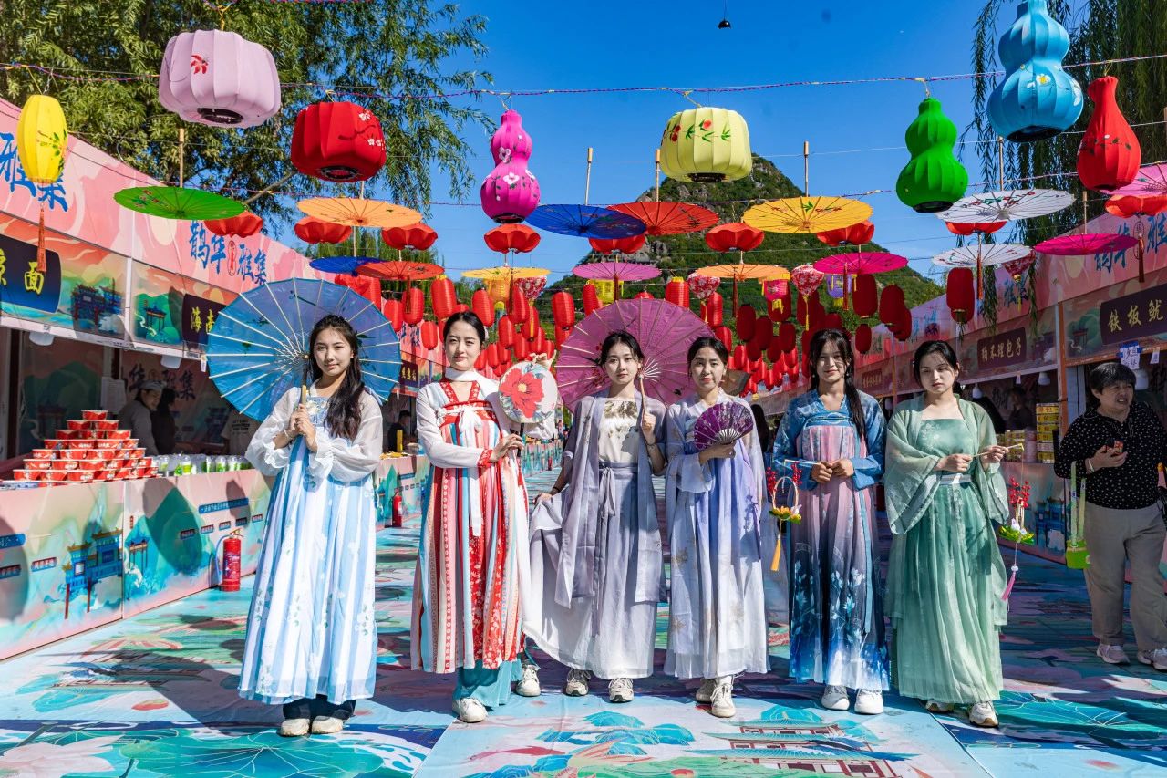 10月1日,濟南華山風景區古風市集——鵲華雅集開市,70多家市集商戶還原古代市集繁榮市貌,現場歌舞不斷、琴聲悠揚。
