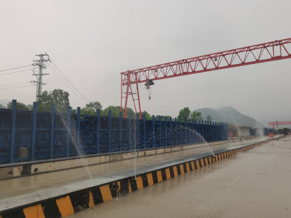 該系統(tǒng)在梁場(chǎng)建設(shè)時(shí)提前在臺(tái)座中預(yù)埋噴淋管道,管道與自動(dòng)供儲(chǔ)水后臺(tái)相連通。當(dāng)T梁模板拆除后,可通過手機(jī)APP控制噴淋系統(tǒng)對(duì)T梁的腹板和翼板進(jìn)行全面均勻噴灑,確保T梁養(yǎng)護(hù)無死角,同時(shí)通過手機(jī)應(yīng)用控制養(yǎng)護(hù)操作,隨時(shí)隨地一鍵啟動(dòng)或關(guān)閉,必要時(shí)選擇自動(dòng)化模式,實(shí)現(xiàn)T梁24小時(shí)不間斷養(yǎng)護(hù)。