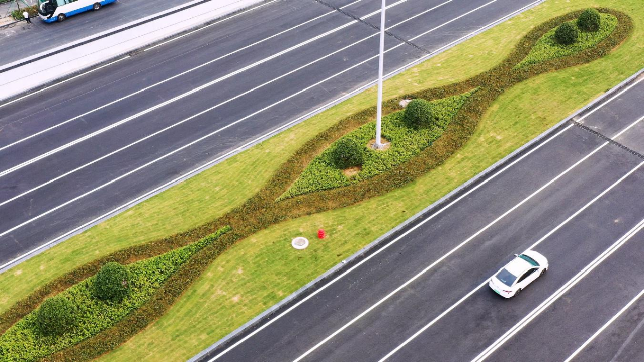 高架橋上采用了創(chuàng)新性非線性排水溝,兼顧橋面排水需求,造價低,施工簡單,耐久性好。道路周邊精心設(shè)計了綠植造型,下穿隧道采用了藍(lán)色星空頂,園林小品的愜意和藍(lán)色星空隧道的靚麗,為濟南機場增添了一抹亮色。在后續(xù)的規(guī)劃中,還將有車輛隧道下穿停機坪,未來,上行飛機、下行車輛,飛機和汽車將實現(xiàn)“空陸同框”。