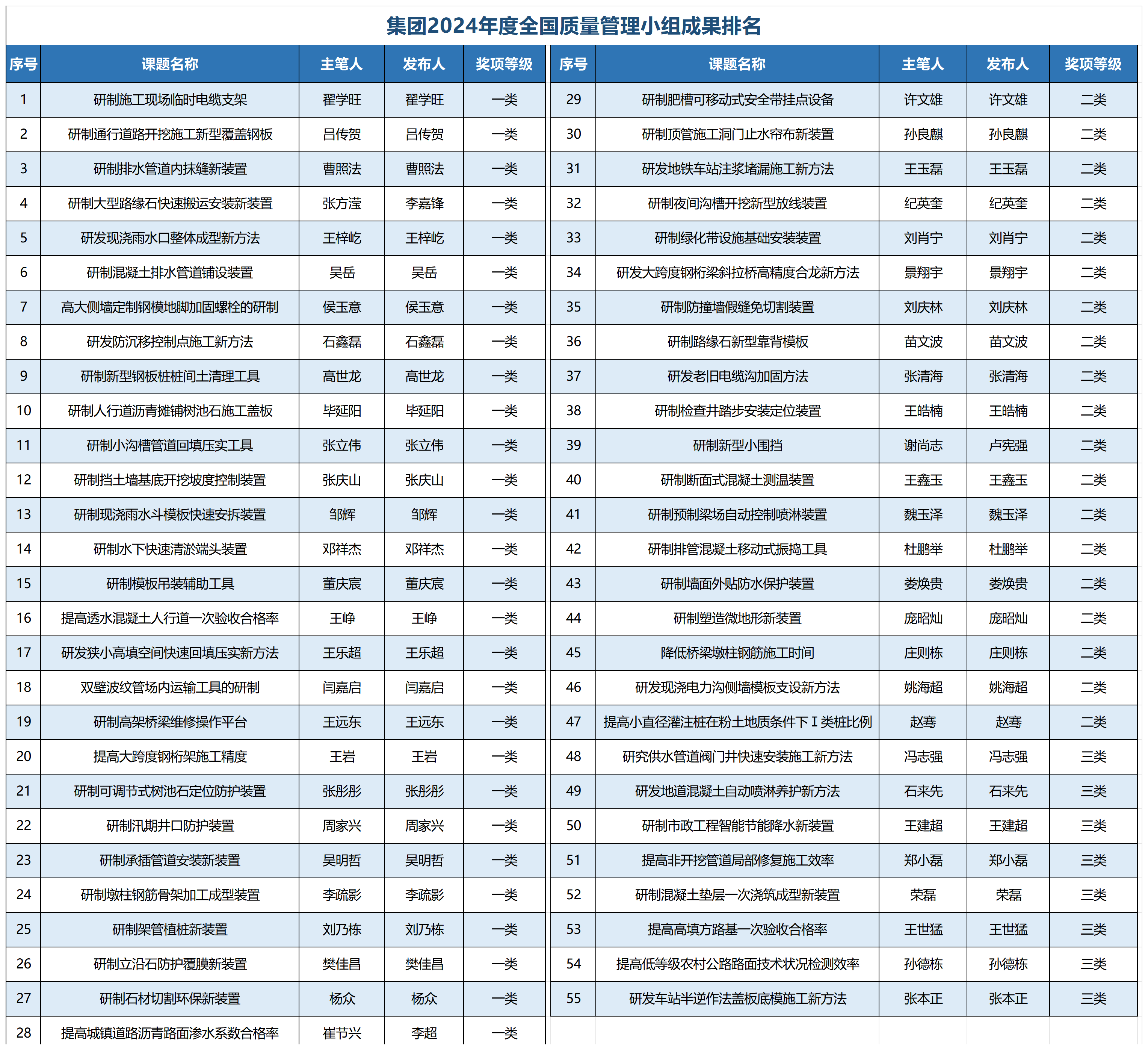 在本次市政工程建設質量管理活動中,城建集團公司發布QC成果55項,其中,一類成果28項、二類成果19項、三類成果8項;發布質量信得過班組成果14項,其中,示范級班組8項、專業級班組5項、推進級班組1項。