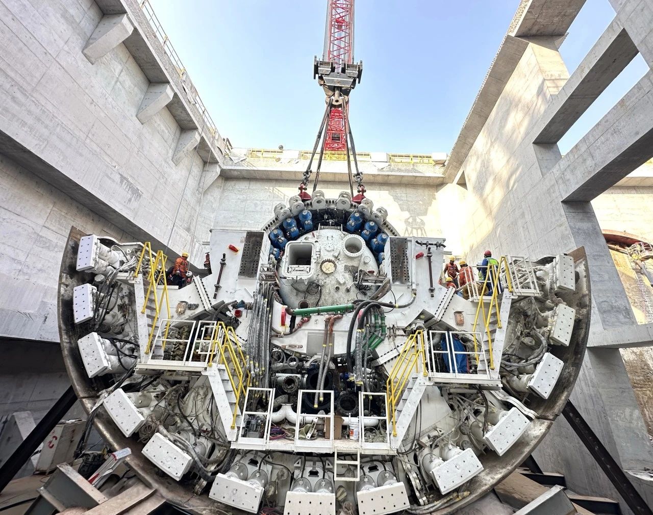 為了確保主驅(qū)動(dòng)順利下井,項(xiàng)目團(tuán)隊(duì)科學(xué)部署、超前謀劃,多次研究施工現(xiàn)場(chǎng),詳細(xì)制定主驅(qū)動(dòng)吊裝下井方案,確保周圍環(huán)境符合施工要求。當(dāng)天上午,隨著指令下達(dá),800噸履帶吊將主驅(qū)動(dòng)平穩(wěn)吊起,在空中經(jīng)歷了起吊、翻身、旋轉(zhuǎn)等一系列高難度動(dòng)作后,經(jīng)過現(xiàn)場(chǎng)一點(diǎn)點(diǎn)調(diào)整方位后,緩緩送入始發(fā)井內(nèi),成功與井下盾體結(jié)合。