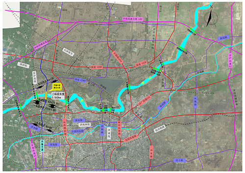 一標(biāo)段南起現(xiàn)狀濟(jì)齊路,向北與虹吸干渠南路、虹吸干渠北路、吳家堡路、治黃路、規(guī)劃路相交,采用高架形式跨越太平河南支路、太平河北支路、美里路、太平河北路、濟(jì)廣高速后,在美里湖路前落地,高架橋兩側(cè)設(shè)置一對(duì)輔道實(shí)現(xiàn)各交通流向的轉(zhuǎn)換,終點(diǎn)接黃河大橋引橋,平面線(xiàn)位與規(guī)劃線(xiàn)位一致,道路全長(zhǎng)3671.89米。